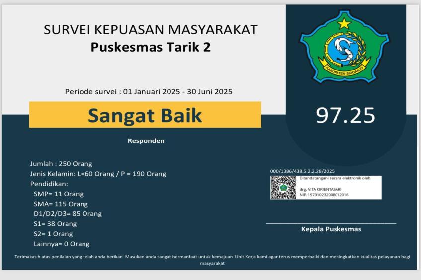 Puskesmas Tarik 2 Raih Nilai Survei Kepuasan Masyarakat Sangat Baik dengan Skor 97,25